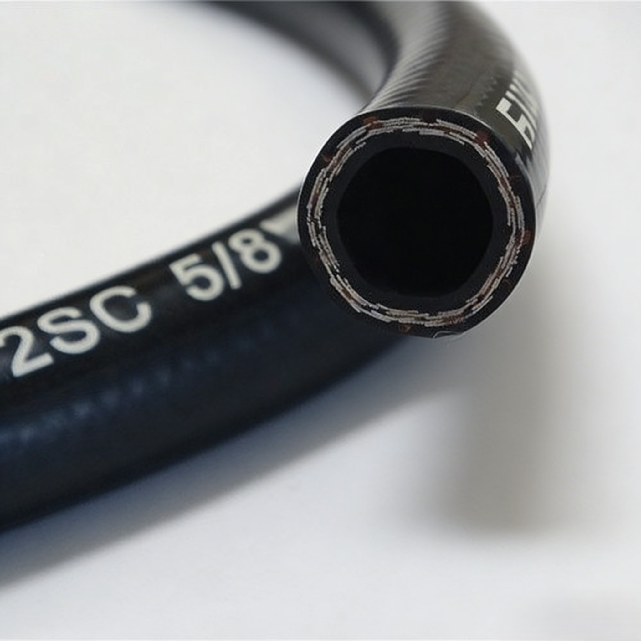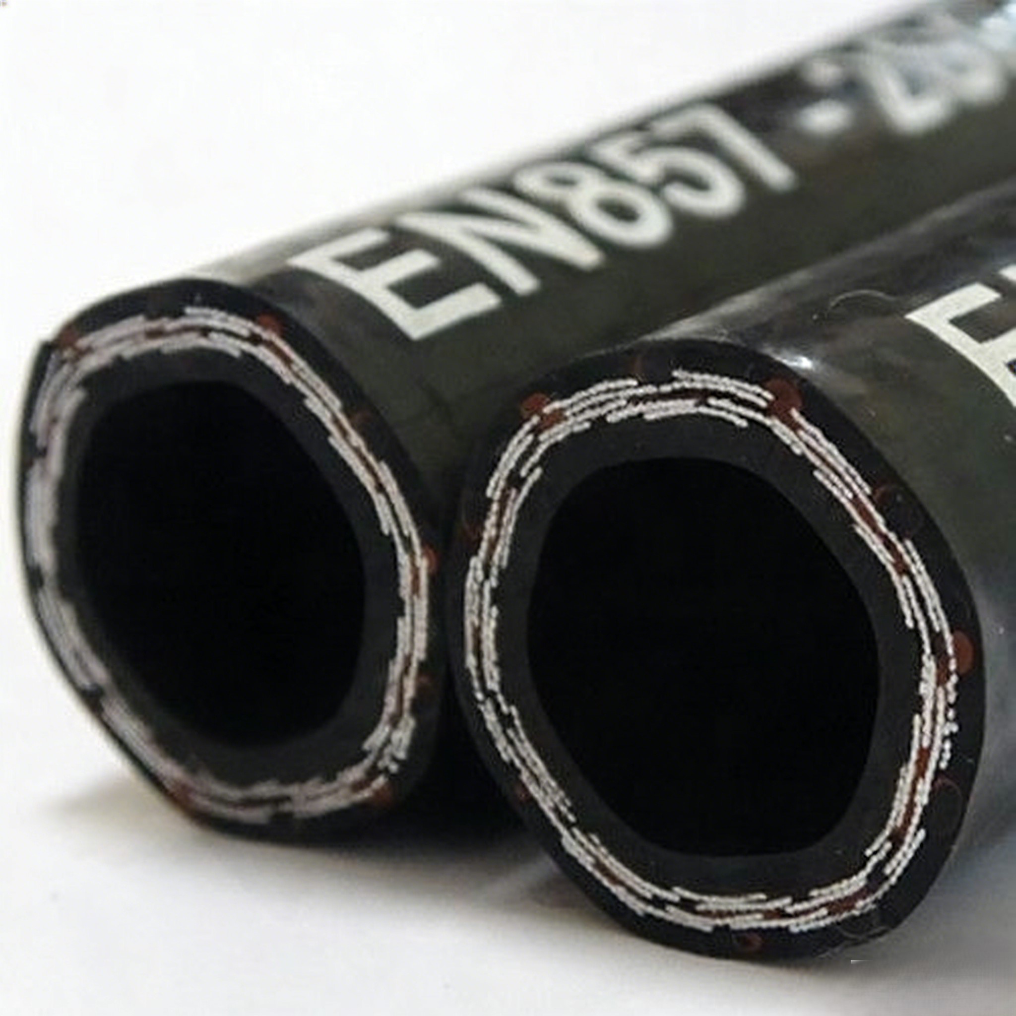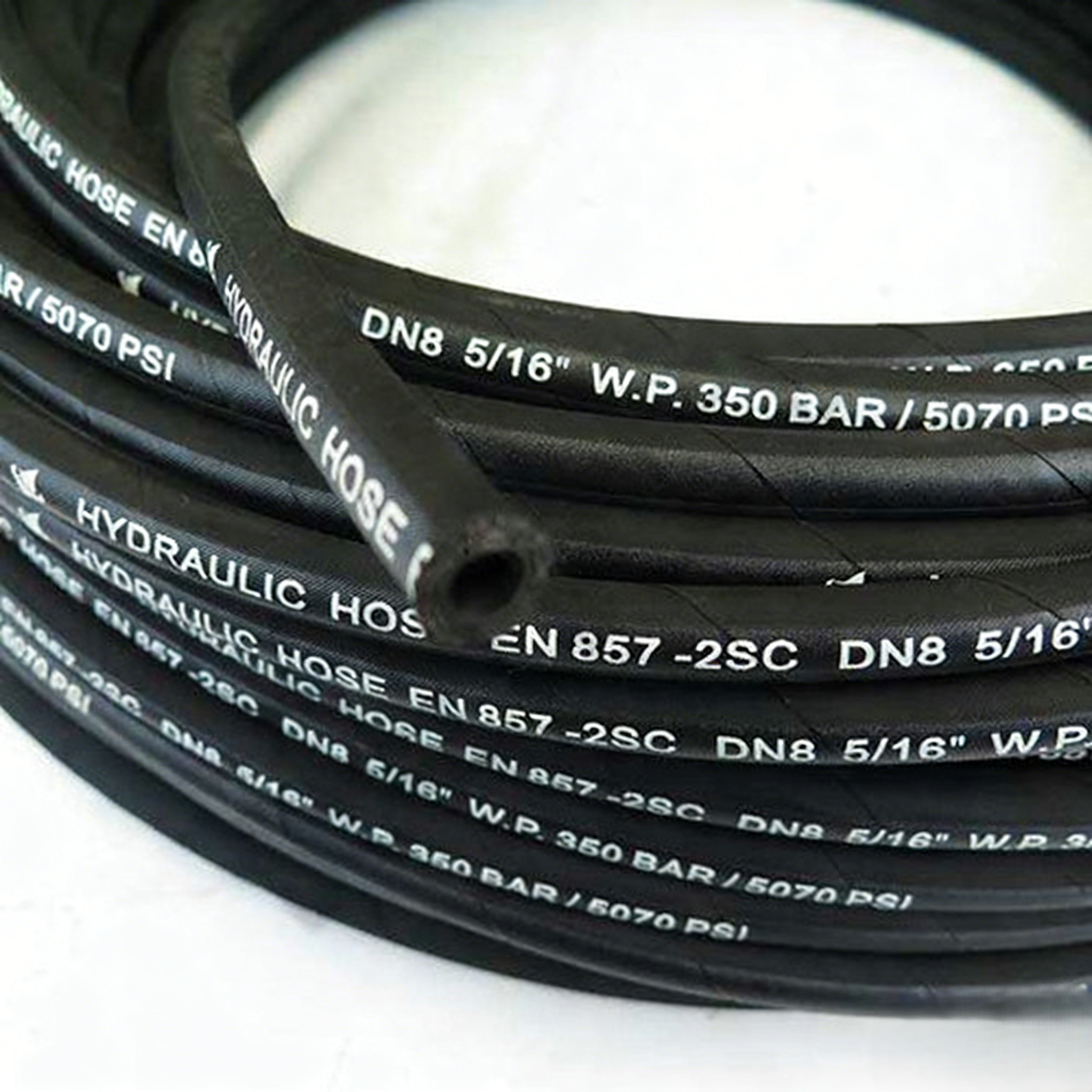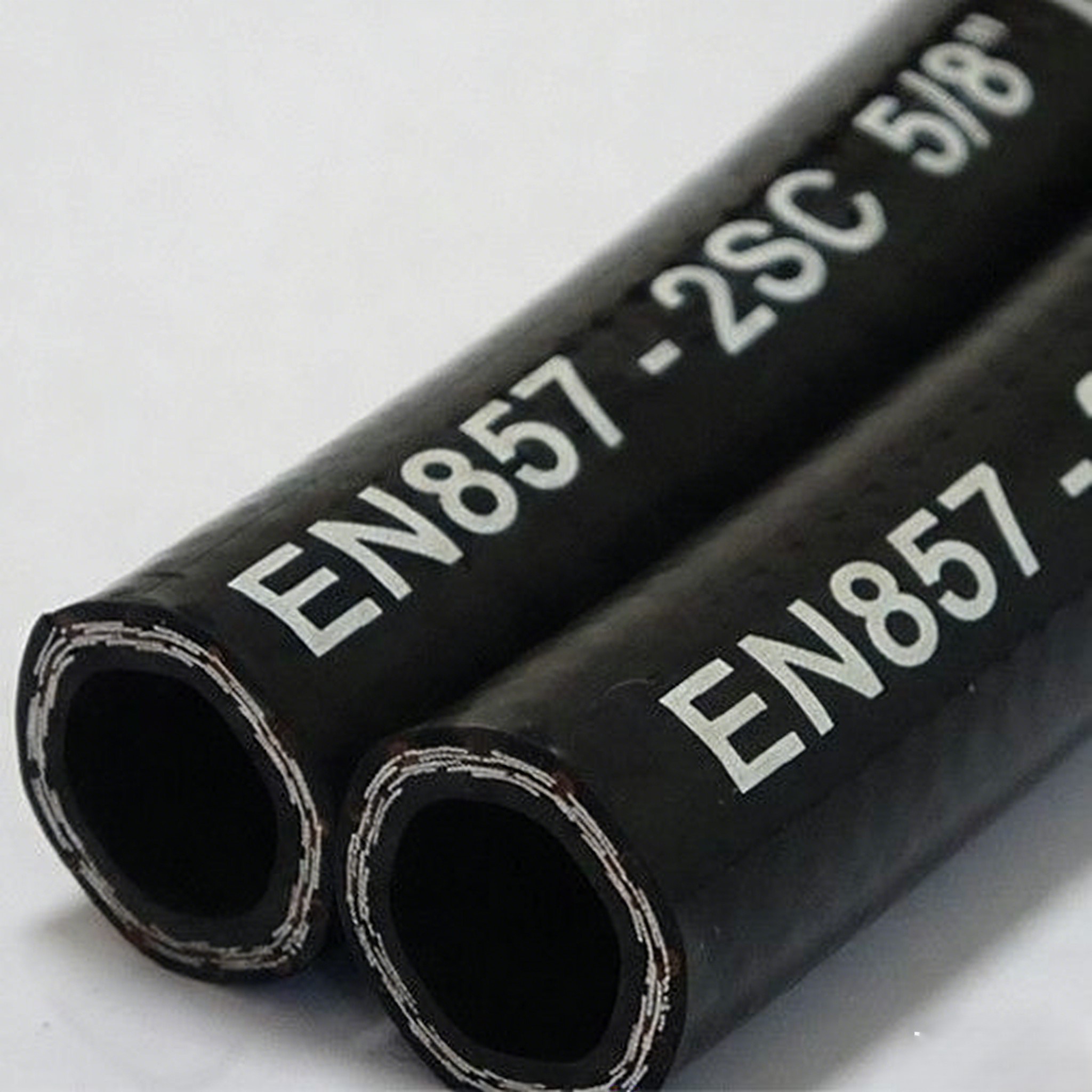 EN 857 2SC steel wire reinforced hydraulic hose is similar to EN 853 2SN steel wire reinforced hydraulic hose in structure. The difference is that it has smaller outside diameter, which is suitable for the equipment piping whose installation space is compact and narrow. It is also composed of three parts: tube, reinforcement and cover. The tube is made from oil, abrasion and corrosion resistant synthetic rubber, making it transport water and petroleum-based hydraulic fluids without any deformation in the working temperature of -40 °C to +100 °C. The reinforcement is made from two layers of high tensile steel wires, making the hose highly resistant to high pressure. Therefore, the hose has excellent performance in the high pressure working conditions. The cover is made from high quality synthetic rubber, making the hose resistant to abrasion, corrosion, chemical fluids, weather, ozone, aging, sunlight and cut.